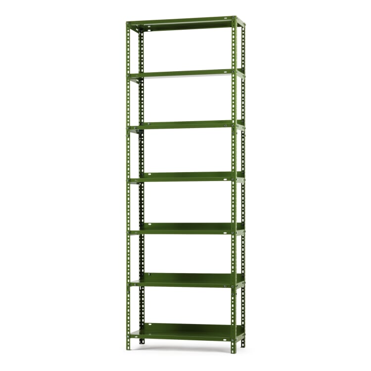 Die Ikone unter den Regalen: Das Stahlregal aus gelochten Winkelprofilen und gekanteten Stahlblechböden wurde seinerzeit von MAGAZIN aus den Lagerhallen in den privaten Wohnraum geholt – eine kleine Revolution. Hier bieten wir es in einer besonders filigranen und formschönen Variante an, die in hochwertigem Industriestandard ausgeführt wurde. Alle Bauteile sind schlanker als üblich. So zeigt es sich ideal im Wohnraum als ein die vorhandene Einrichtung ergänzendes Möbel. Sechs der sieben Fachböden besitzen an ihrem hinteren Ende eine Aufkantung, um Bücher und andere Gegenstände zu sichern. Der obere Abdeckboden besitzt keine Aufkantung, ist also flach. Für eine Nutzung als Bücherregal empfehlen wir die separat angebotenen Buchstützen, die über die Vorderkante des Fachbodens gesteckt werden und knapp die gesamte Tiefe des Regals ausfüllen.