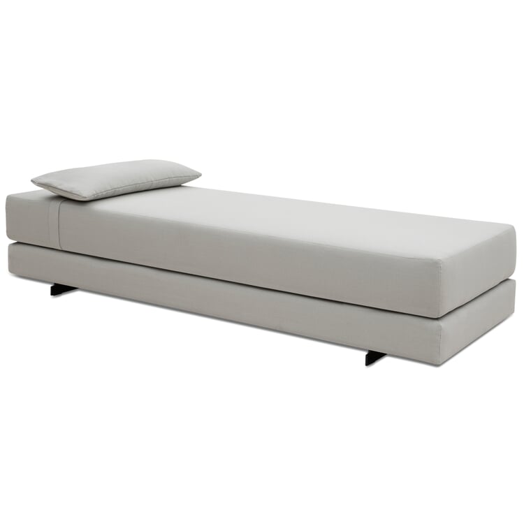 Die Liege KOLTER ist seit Langem ein Teil unseres Sortiments. In der Version ECO ist sie Teil unseres Projekts zur Verbesserung der ökologischen Bilanz von Polstermöbeln, denn alle konstruktiven Komponenten sind komplett zerlegbar. Der Bezugsstoff ist aus Bananatex®, einer natürlichen Alternative zu synthetischen, erdölbasierten Textilien. Formschön und reduziert, ohne gestalterische Allüren, als Gästeliege und auch als schlichtes rückenlehnfreies Sofa oder Daybed nutzbar. Zwei Taschenfederkernmatratzen sorgen für den Liegekomfort und eine gute Belüftung der Liegefläche. Wird die Matratze von der unteren Basis getrennt und neben die bestehende Liegefläche gelegt, erhält man die doppelte Breite. Im Lieferumfang enthalten ist ein flaches Kissen (80 × 13 Zentimeter). Die schwarz lackierte Stahlkufe ist einfach zu montieren.