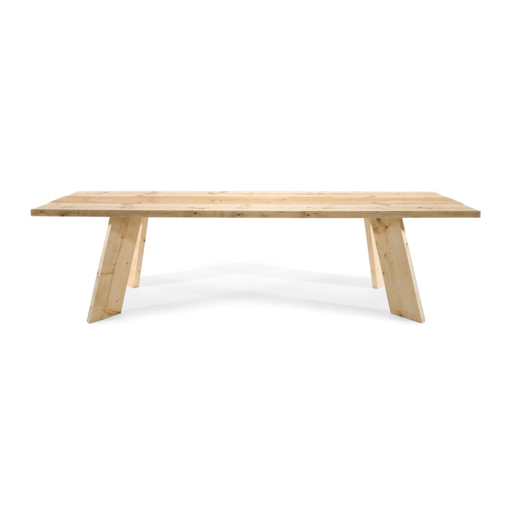 Bricht mit den Konventionen für massive Holztische: FELDMARK ZWO besteht aus sieben Bohlen, die beschlagfrei gesteckt und mit vier Buchenholzkeilen gehalten werden. Schon das Zusammenstecken und Fixieren mit kräftigen Hammerschlägen sorgt für ein archaisches Erlebnis. Seine raue Oberfläche bleibt ungezähmt – weder Wachs, Öl und erst recht kein Lack verschließen hier die Poren.