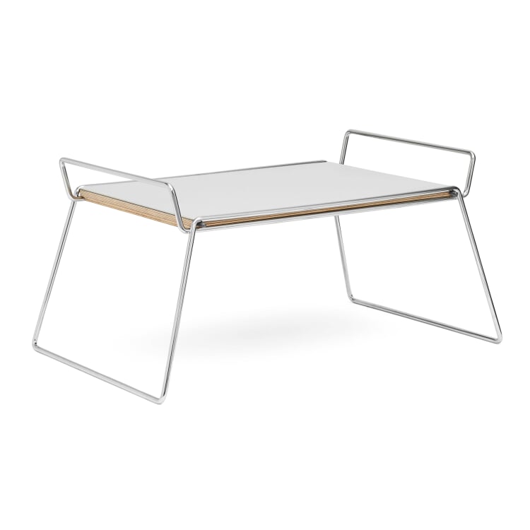 Tablett und Tisch im gleichen Maße und schönes kleines Universalmöbel: Beistelltisch neben Sessel oder Sofa, Serviertablett im Bett, Arbeitstisch auf dem Sofa, kleiner Spielplatz für die Kinder – kaum eine Situation im Alltag, bei der BLOCH nicht eine gute Aufgabe findet und seine Rolle perfekt erfüllt. Die stabile Stahldrahtstruktur trägt eine mit Linoleum belegte Platte. An den ergonomisch gut platzierten und ausbalancierten Griffteilen lässt sich die Konstruktion gut und sicher tragen.
